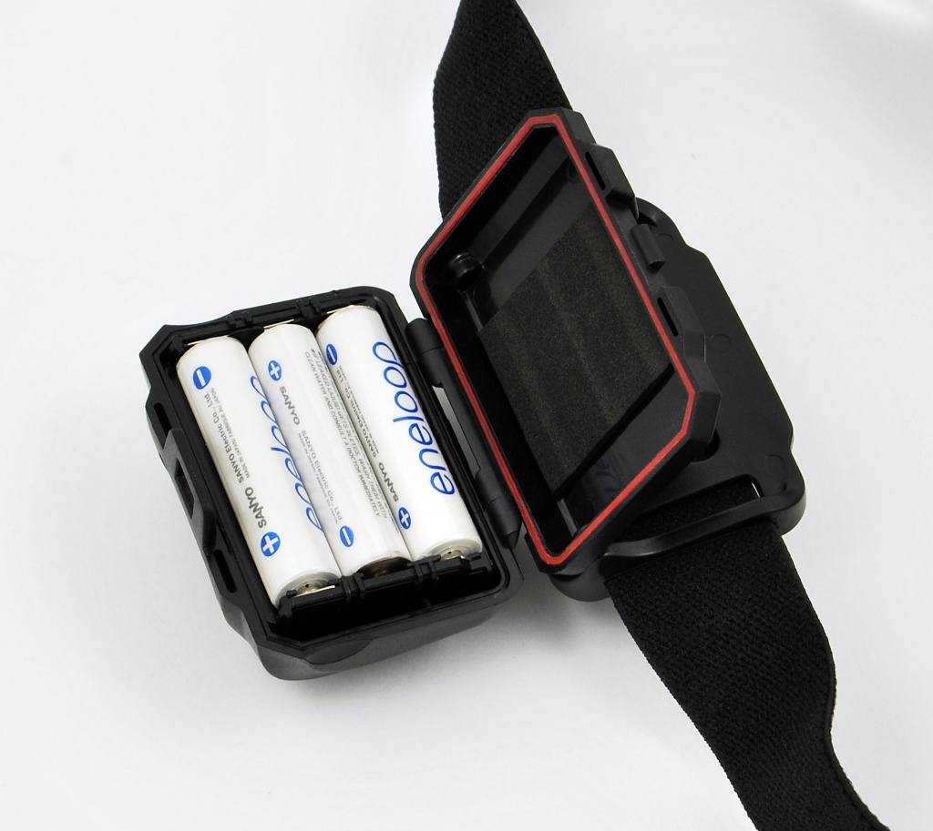 Čelovka osazená CREE led (USA), 3 x AAA (není součást balení), výdrž 8 h, max světelný tok 150 lm, 2 postranní červené LED.