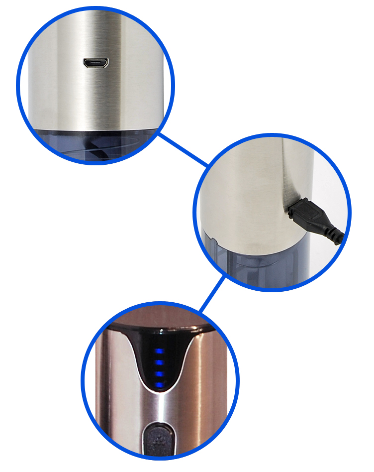 Otvírák CEL-TEC Metal 210A je vybaven snad nejrozšířenějším konektorem současnoti - microUSB. Tedy stejným konekterem, který mají všechny moderní mobilní telefony. Není tak třeba opatrovat jeden speciální kabel a bát se jeho ztráty. Uvnitř těla otvíráku je ukryta nabíjecí Ni-MH baterie o kapacitě 600mAh, což je dostatek pro otevření až 40 lahví. O stavu baterie máte navíc perfektní přehled díky čtyřem LED diodám, které indikují momentální kapacitu a stejně tak stav nabíjení, pokud je otvírák připojený na nabíječku.