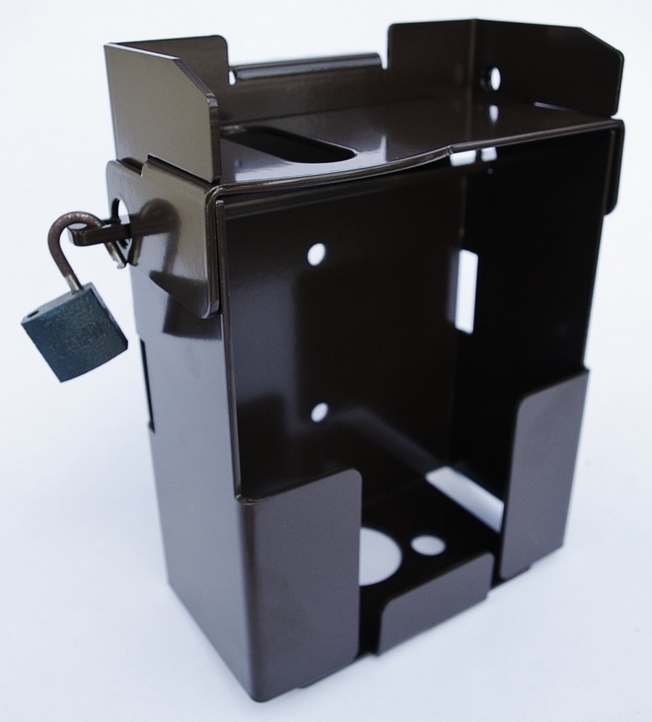 Ochrání fotopast před krádeží a poškozením a navíc garantuje vždy správné nasměrování vložené fotopasti. Upevňuje se vruty za otvory v zadní stěně nebo popruhem a lanovým zámkem pro které jsou připravené průvlaky. Skříňka je vyrobena ze silného ocelového plechu a opatřena kvalitním práškovým lakem.